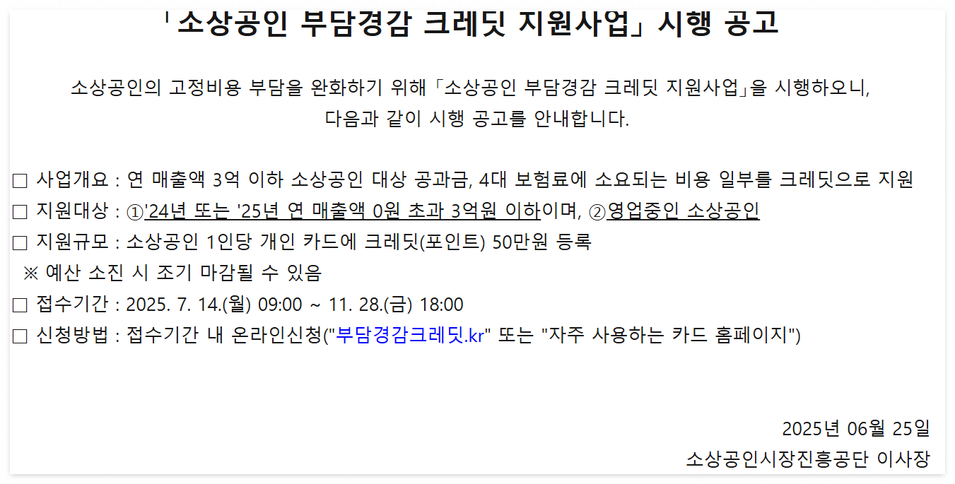 ‘소상공인 부담경감 크레딧’은 단순히 50만원 지원금이 아닙니다. 소상공인의 고정비 절감, 경영 안정, 실질적인 비용 절감을 동시에 지원하는 현실적인 정책입니다. 특히, 신청 절차가 간소화되어 세무 지식이 없어도 누구나 쉽게 신청 가능하며, 2025년 하반기 경제 회복을 위한 핵심 소상공인 지원 정책으로 평가받고 있습니다. 지금 바로 소상공인24 또는 부담경감크레딧.kr에서 신청하시고 사업 운영 부담을 확실히 줄이세요.