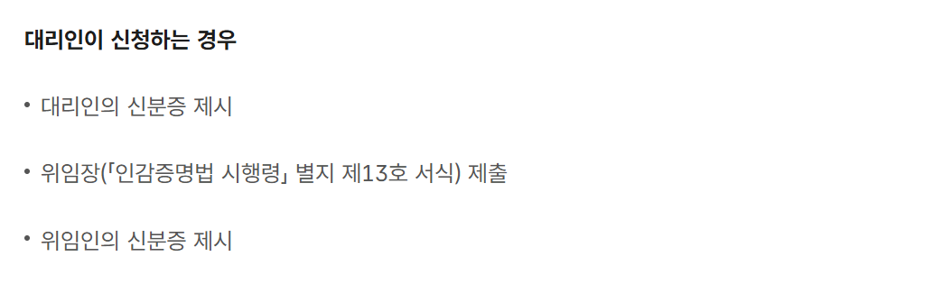 즉, 위임장 + 신분증을 갖춘 경우에만 가능하며, 가족이라 하더라도 위임장이 없으면 인감증명서 대리발급이 불가합니다.